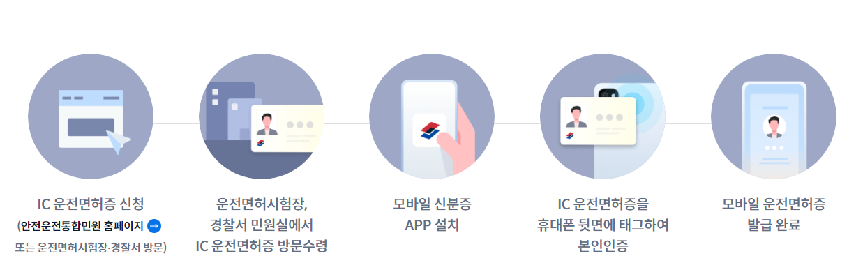 이후 IC운전면허증이 발급되면 해당 수령장소(인근 시험장 또는 경찰서)에 방문하여 IC 운전면허증을 받고 이때에는 "모바일 신분증" APP 설치 및 접속하여 발급받은 IC운전면허증을 등록하시면 됩니다.